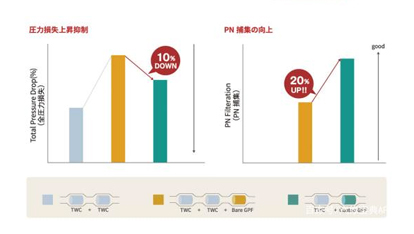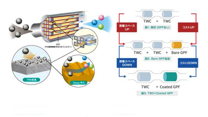 GPF (Gasoline Particulate Filter) is a ceramic filter that evolved from a flow-through three-way catalyst and is installed in the emission system of gasoline engines. It is generally cylindrical in shape.